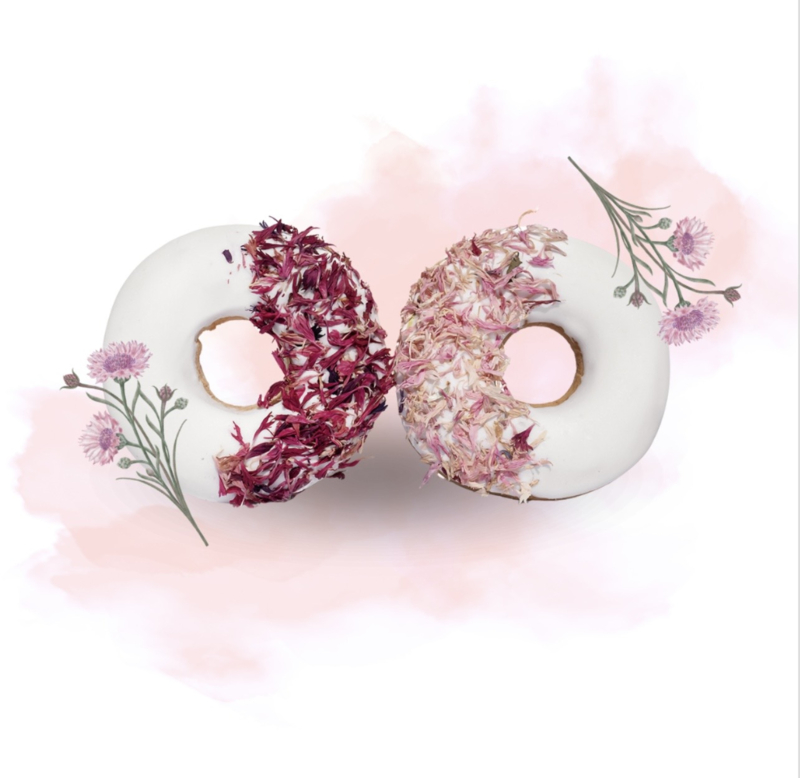 Twee handgemaakte donuts met roze korenbloem – natuurlijke, kleurrijke en rustgevende paardenkoekjes.